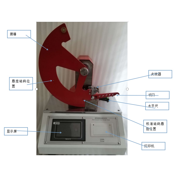擺錘:產(chǎn)生撕裂力矩,撕裂試樣; 夾紙器:用于夾持、固定試樣; 切刀:在試樣上切出撕裂口; 顯示屏:點(diǎn)陣式液晶顯示屏,系統(tǒng)操作界面; 打印機(jī):微型高速熱敏打印機(jī); 按鍵面板:用戶對儀器進(jìn)行操作的面板; 安裝腳:四個(gè)安裝腳,可調(diào)節(jié)儀器安放的水平性和穩(wěn)定性