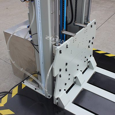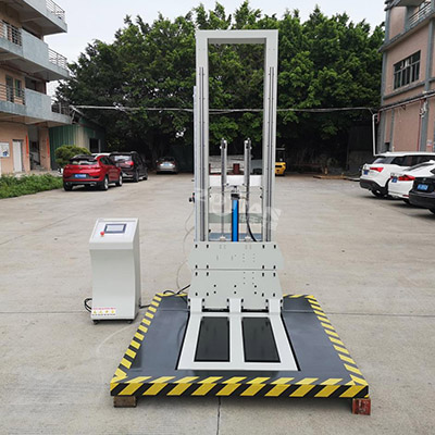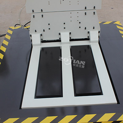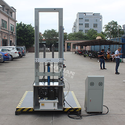 對于大型包裝貨物,一般質量較大,在運輸,搬運時垂 直跌落的高度較低,因此,要求跌落試驗臺的試驗跌落高度也較低,零跌落試驗機主要用于較大型包裝件作跌落試驗。零跌落試驗機由一個可以快速向下移動的“E”型叉作為試件托架,被試貨物按試驗要求(面,棱,角試驗)放置平衡。試驗時,托板高速向下運動,脫離試件,“E”型叉在被試包裝貨物跌落至底板前,已在效率減振器的作用下,嵌平于底板,從理論上,零跌落試驗機可從零高度至大跌落高度范圍作跌落試驗。