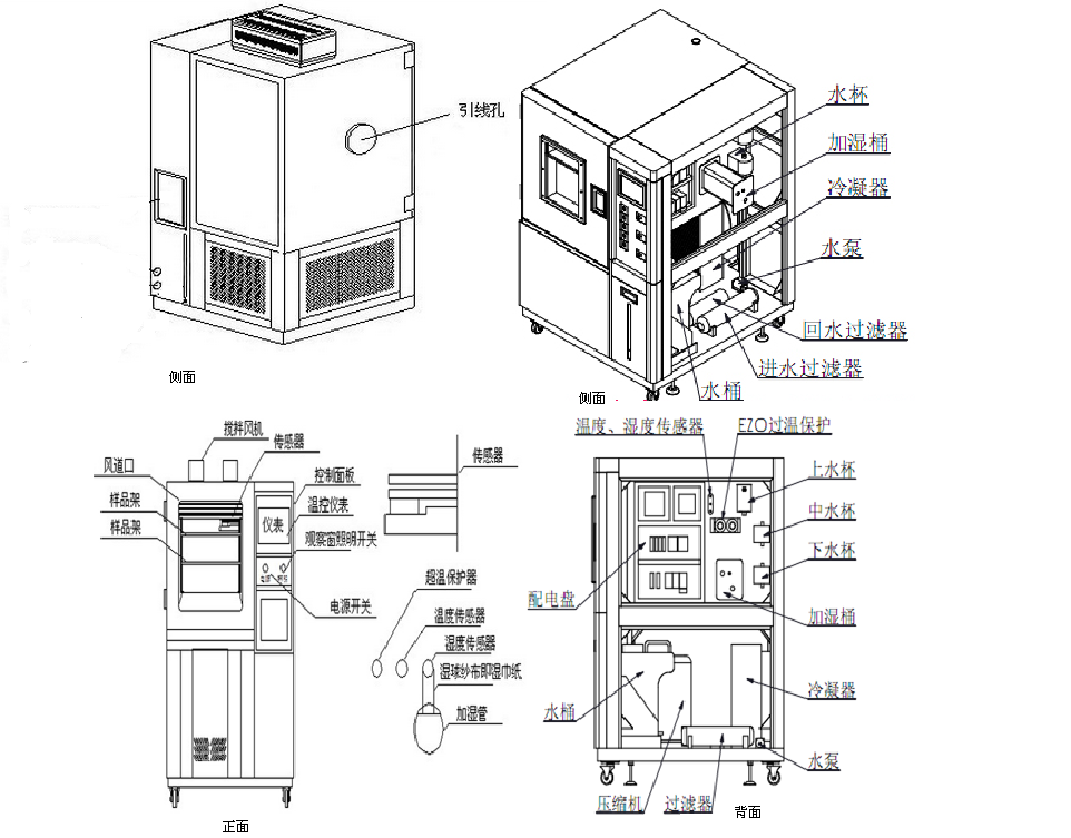 在底部設置放水口可以讓箱內的液體自由順暢地流出,即液體不能積存在箱體底部箱體下面有個裝水箱配有水刻表,裝水箱灌入蒸餾水,純凈水,桶裝水勿接自來水或者會被自來水里的物質堵塞 |